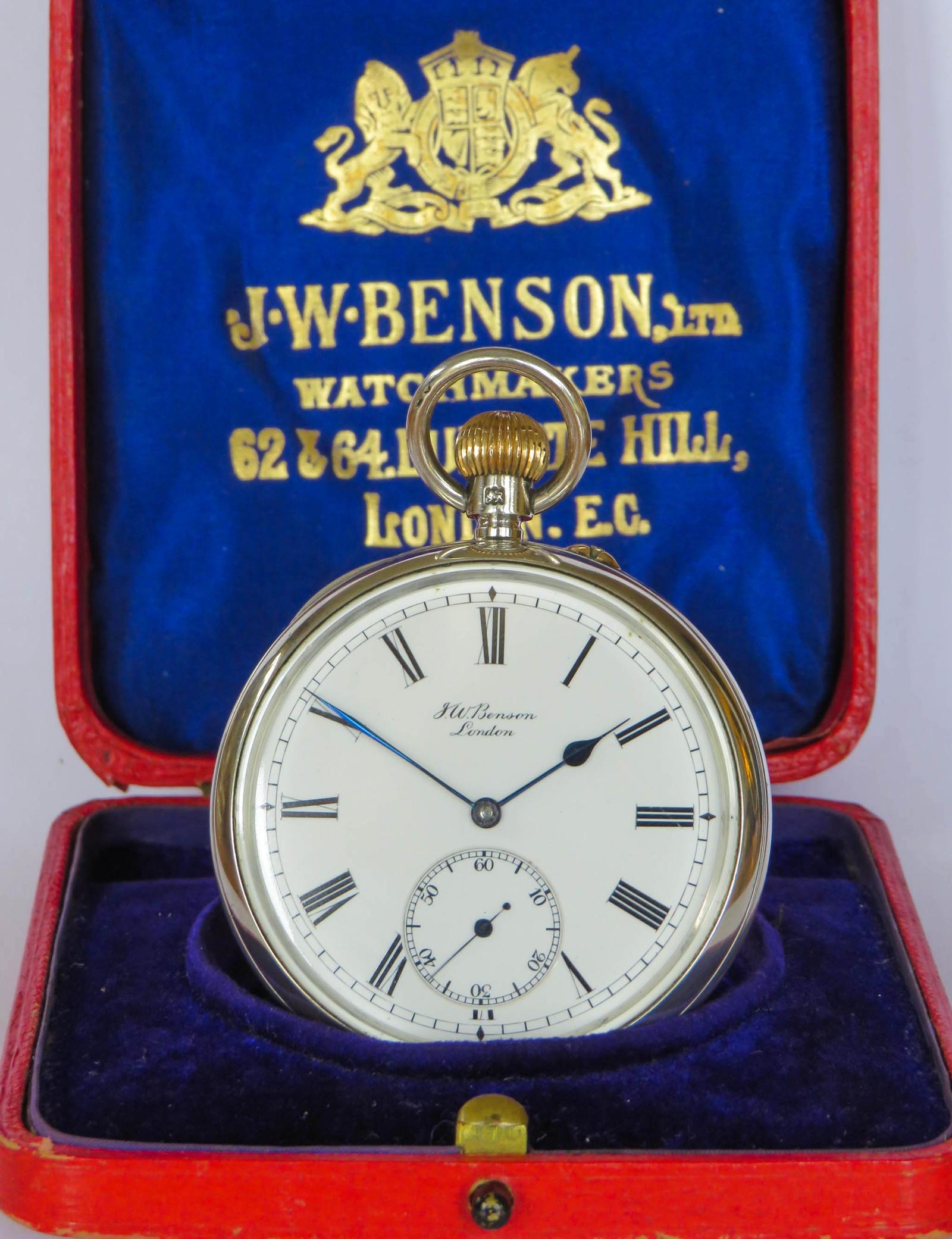 The watch measures 53mm diameter excluding the winding stem and the loop. The case is silver and there are hallmarks inside both of the case backs for London 1911, with a sponsor’s mark for J W Benson. The front and sides of the case are in super condition. The hinged case back has light surface marks and the odd minor indentation but nothing serious at all. Overall, very nice condition for a watch of this age.