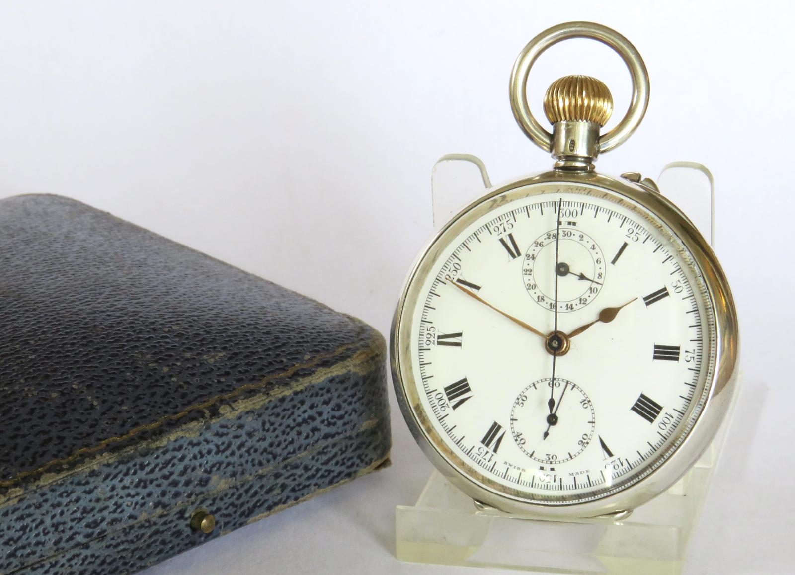 Pocket Watch: Antique Silver Moeris Chronograph Pocket Watch 1924