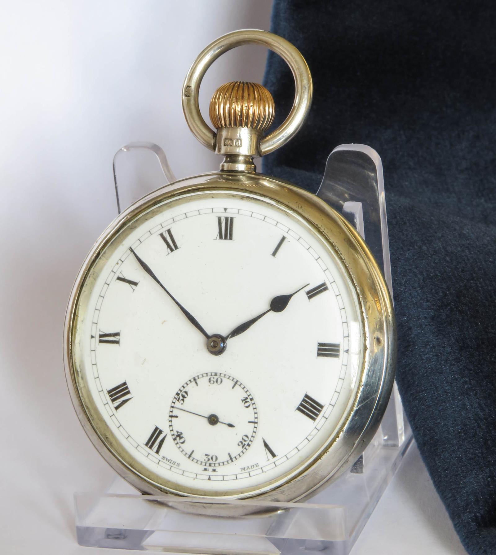 The watch measures 50mm diameter excluding the winding stem and the loop. The case is silver and there are hallmarks inside both of the case backs for Birmingham 1903 with a case maker’s mark for Aaron Dennison, an English case manufacturer and supplier to various watch makers. The case has some minor marks but overall is in good condition.