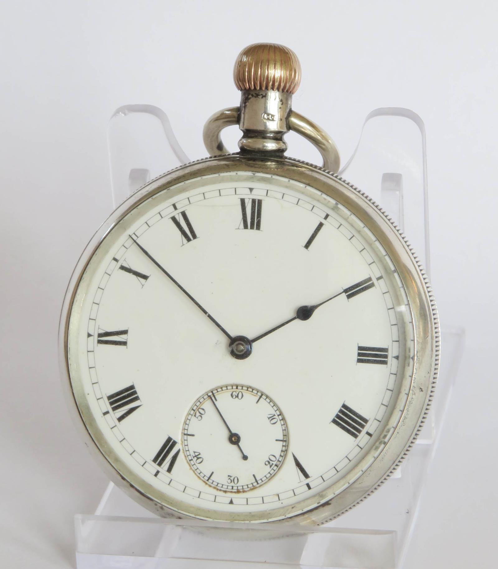The watch measures 49mm diameter excluding the winding stem and the loop. The case is silver and there are hallmarks for Birmingham 1907 with a case maker’s mark for Aaron Dennison, manufacturer of cases for Waltham UK. The case is in good condition, just one small “ding” to the side and general rubbing to the engine turned detail to the back of the watch, just from sitting in a pocket.