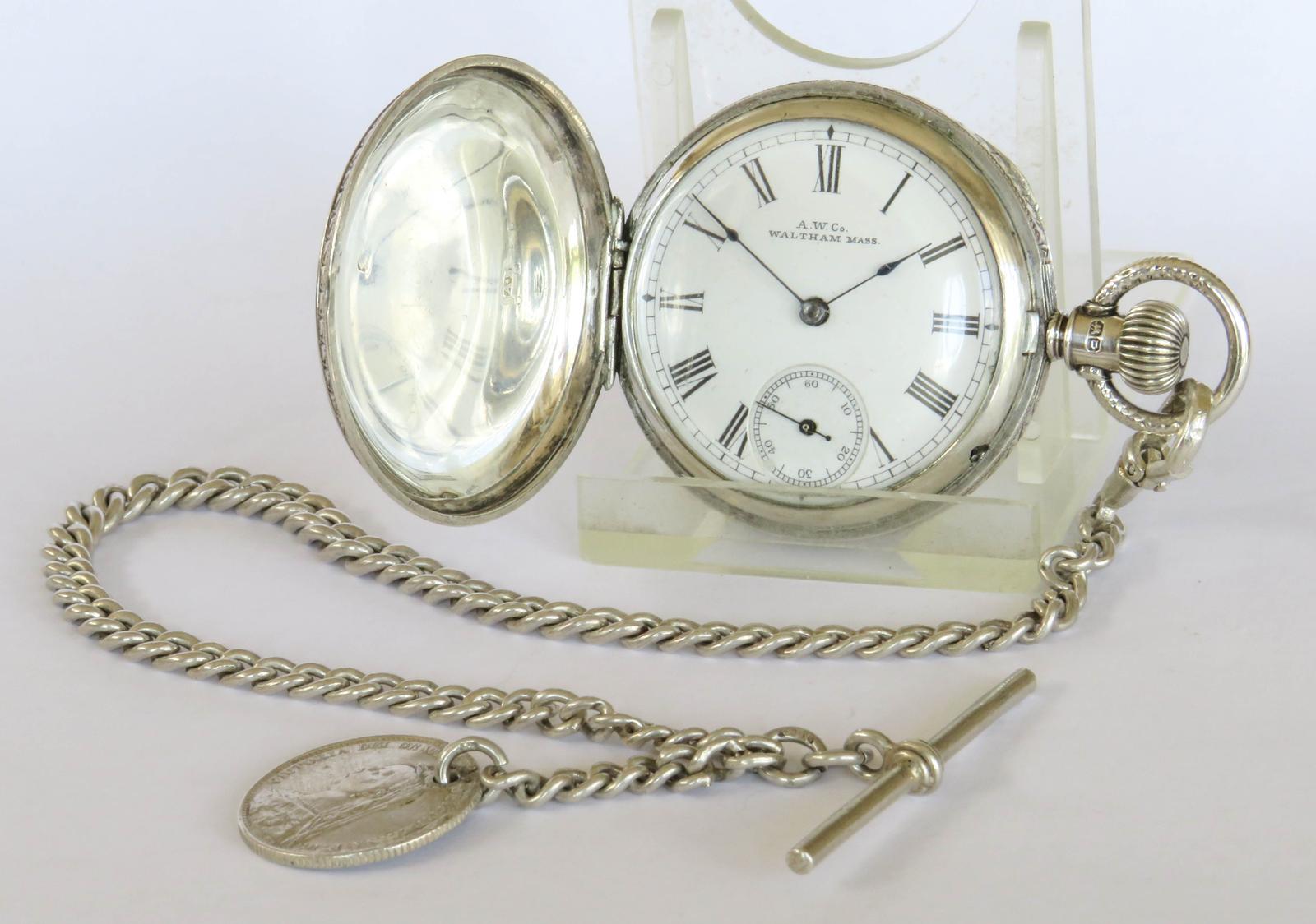 Pocket Watch: Antique Silver Waltham Royal Hunter Fob Watch & Chain
