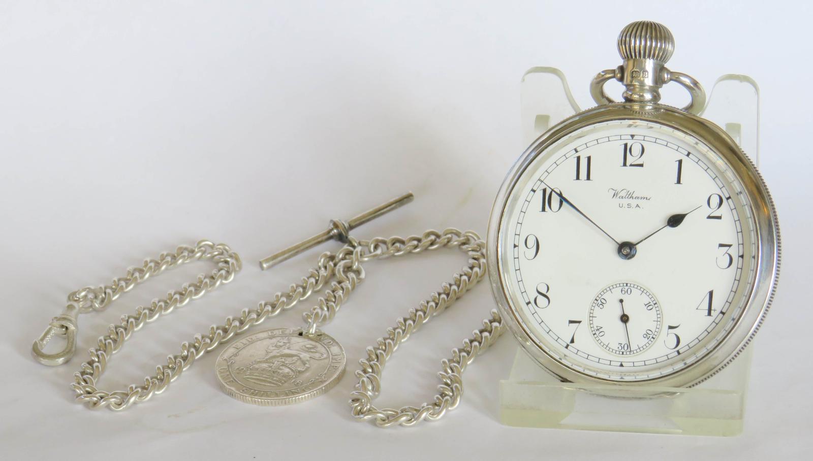 Pocket Watch: Antique Silver Waltham Traveler Pocket Watch with Chain