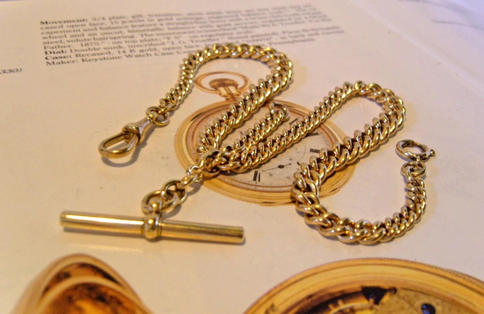 Gentleman's large and absolutely magnificent 10ct rolled gold (professionally tested and is known in the USA as gold filled) traditional chunky curb link Antique pocket watch chain /double Albert with original big swivel T bar, dog clip and bolt ring.