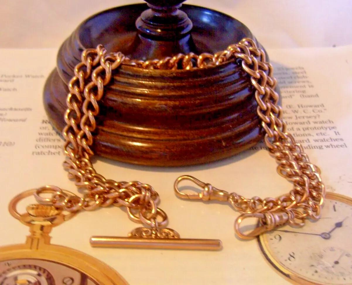 Pocket Watch Chain 12ct Rose Rolled Gold Antique 1890s Albert with Fancy T Bar