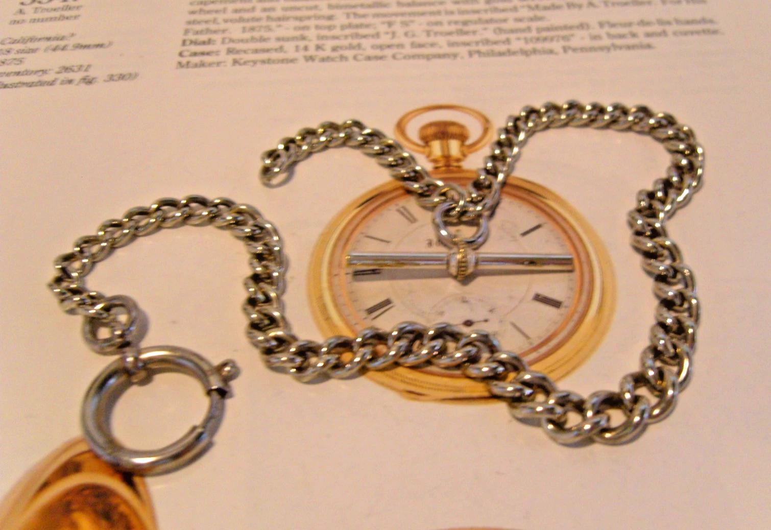 Robust large T bar to one end (measures 3.8cm length) and secure big bolt ring to the other end (measures 2.2cm diameter and operates correctly) which is ideal for a Railroad pocket watch which usually has a 'fat' bow.