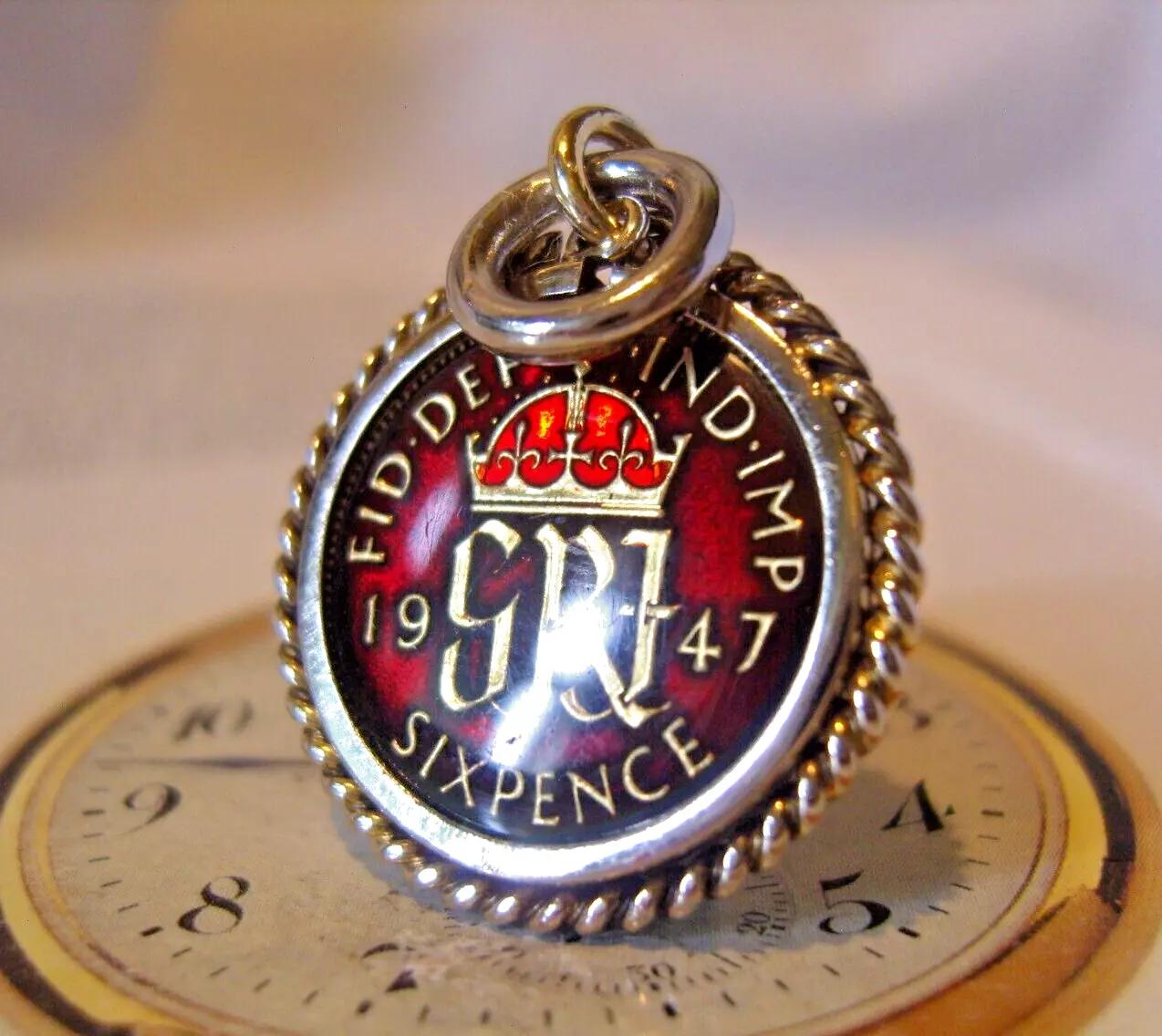 Pocket Watch Chain Coin Fob 1947 Vintage Enamelled English Silver Sixpence