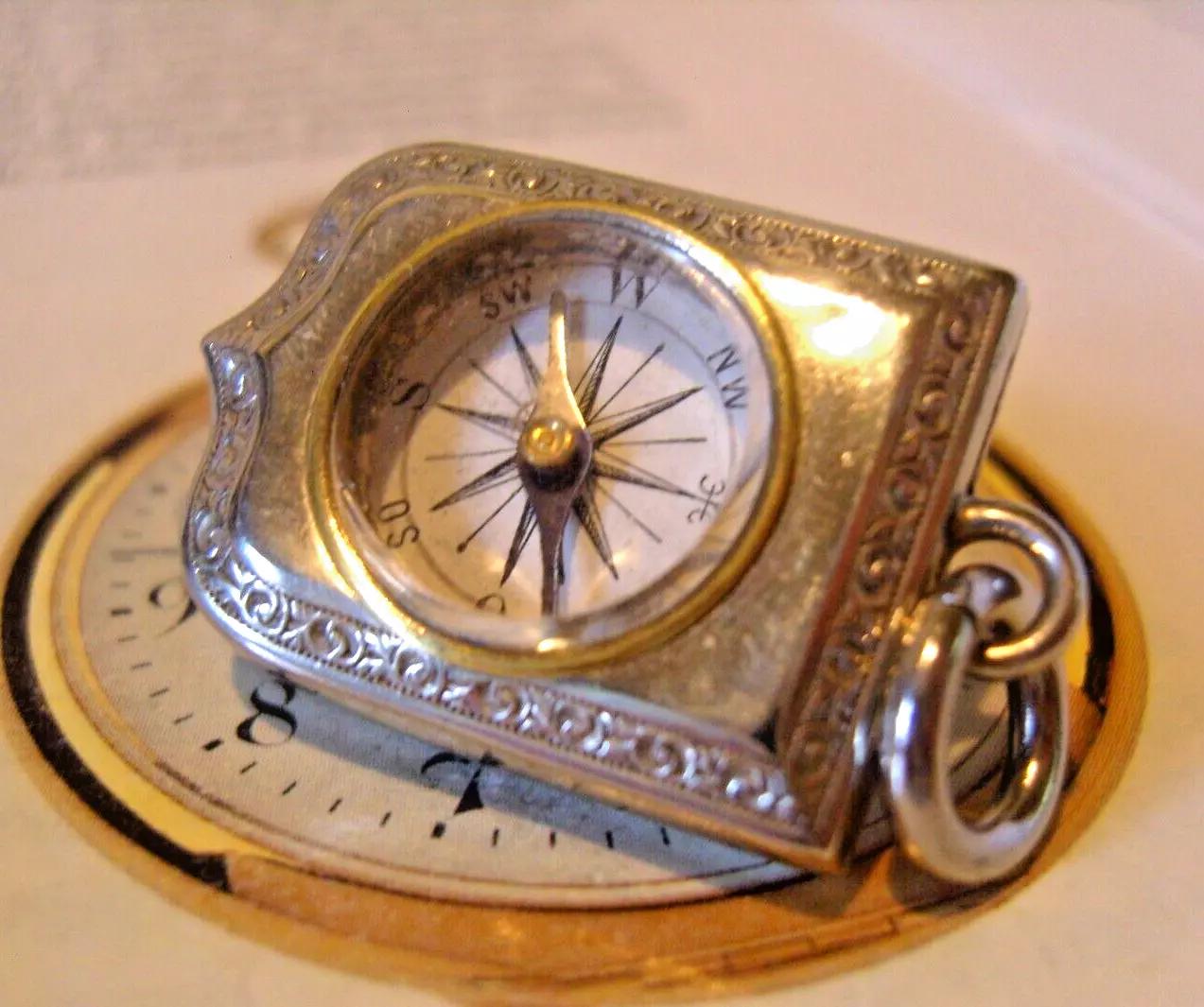 Pocket Watch Chain Compass Fob 1920s Large Silver Nickel Antique Shield Fob