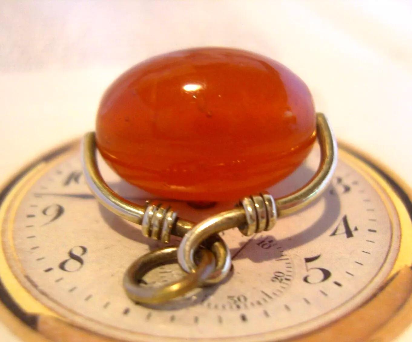 Pocket Watch Chain Fob 1920s Brass & Orange Glass Stone Antique Spinner Fob