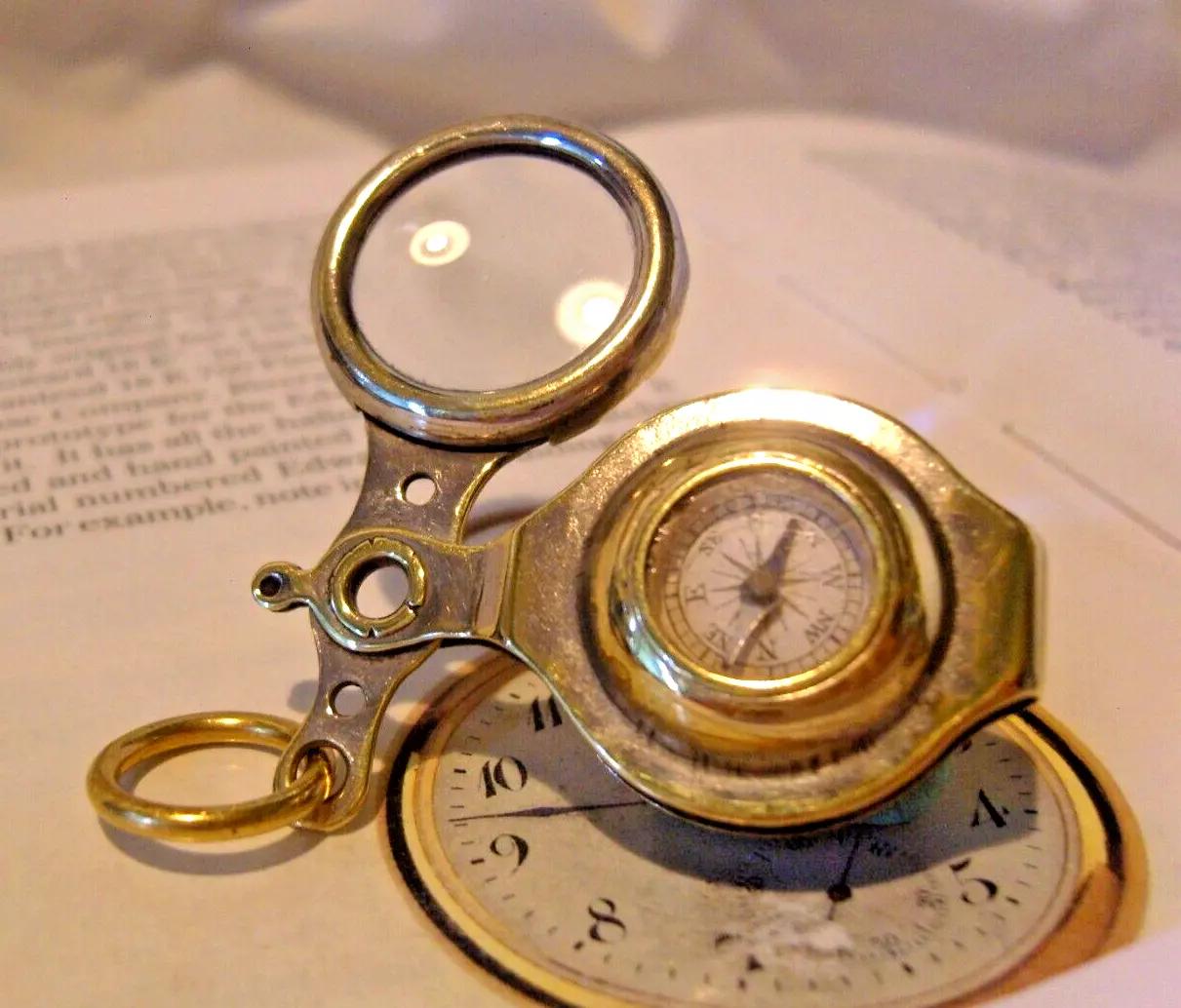 Pocket Watch Chain Fob Compass & Magnifying Glass 1920s Large Antique Brass Fob