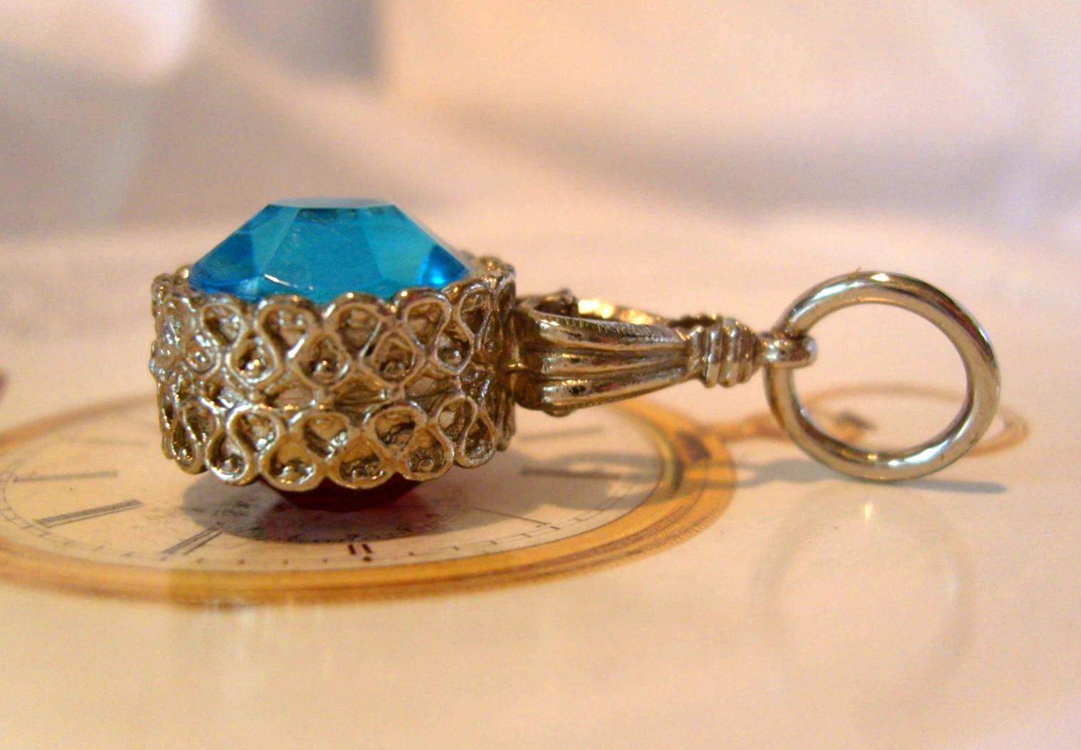 Pocket Watch Chain Fob Silver Plated 1950s Red & Blue Glass