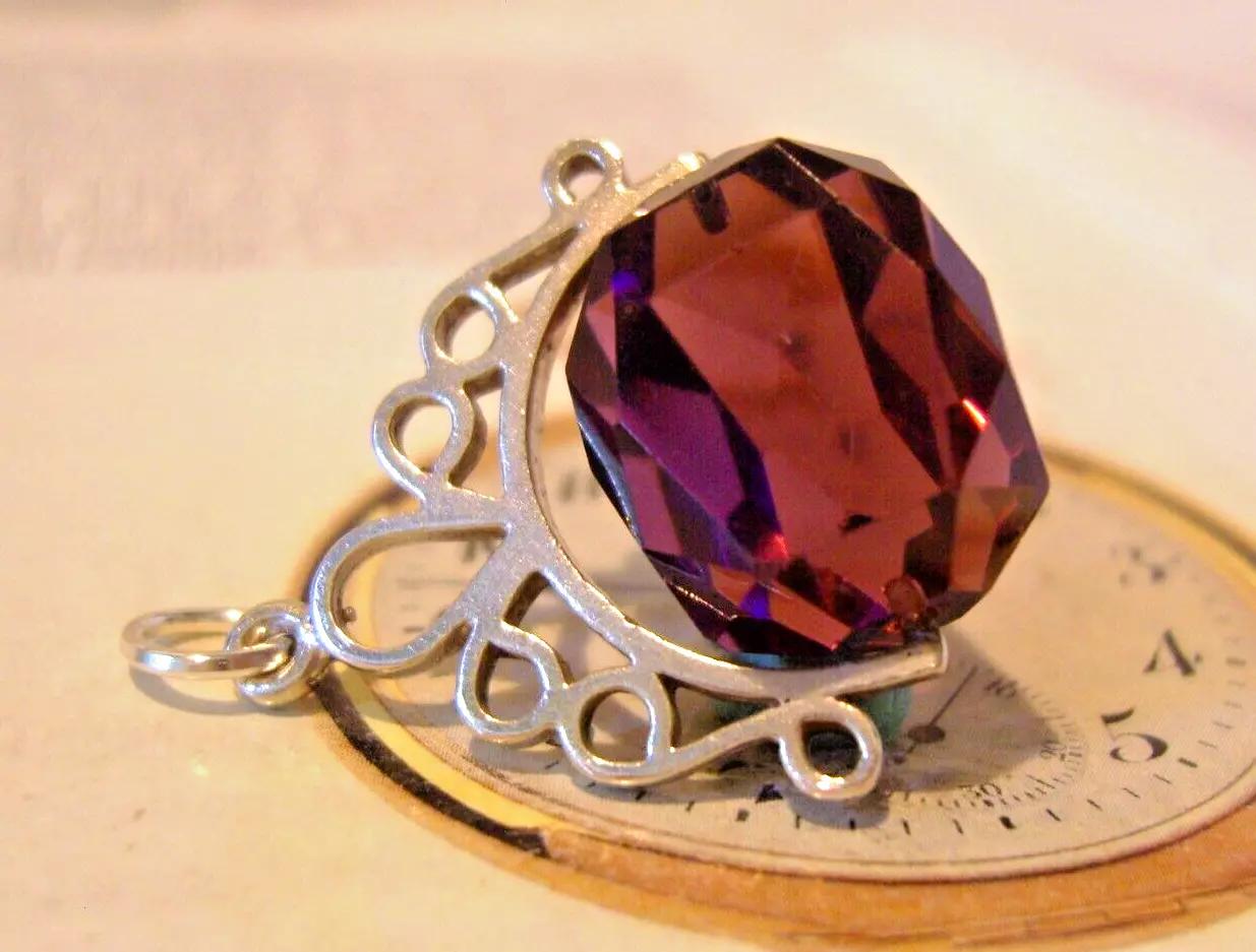 Pocket Watch Chain Fob Silver Spinner With Amethyst Glass Vintage 1970s
