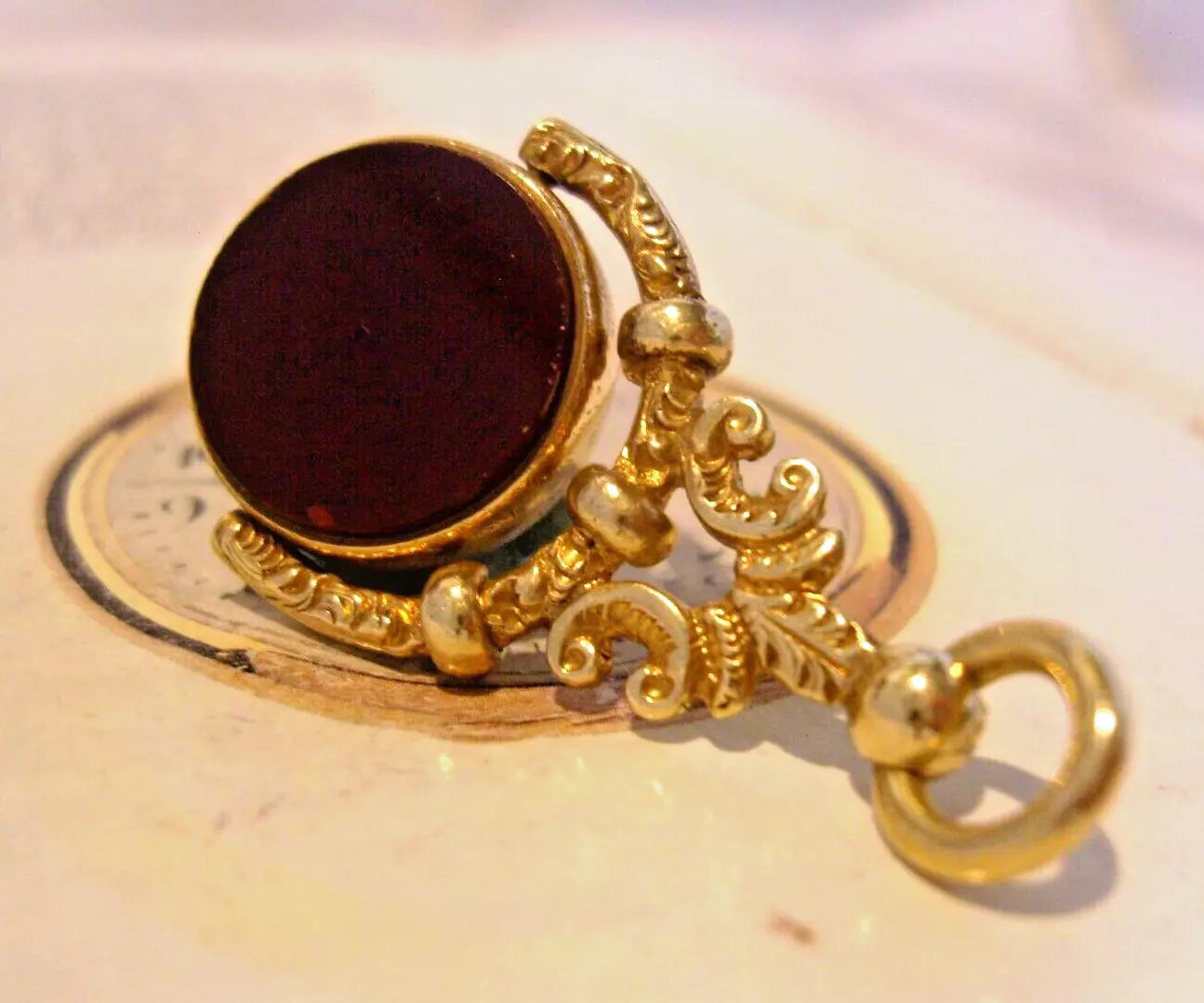 Pocket Watch Chain Fob Spinner 1830s Large Victorian Gilt Bloodstone & Carnelian