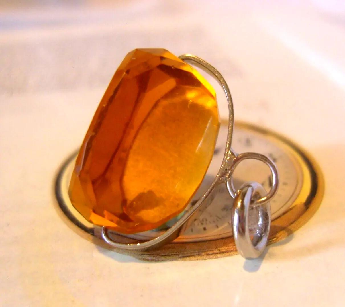 Pocket Watch Chain Fob Spinner 1960s Vintage Chrome & Large Vivid Citrine Stone