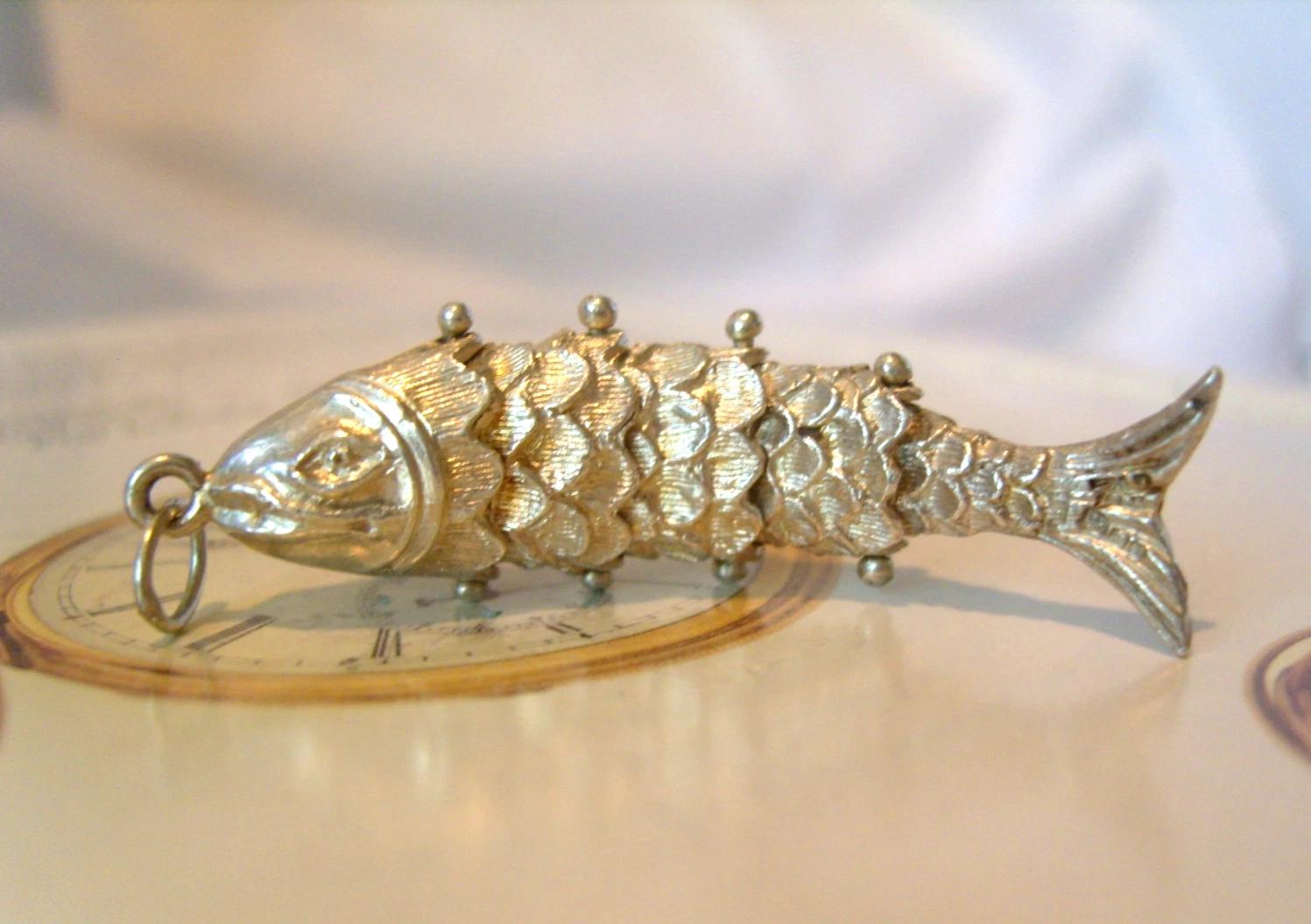 Wonderful and highly detailed large Sterling silver articulated wiggly fish (reflects the light beautifully and very tactile) which is clearly hallmarked (within different shaped, recessed cartouches); Lions head (London assay), Lion Passant (Sterling silver) and fancy uppercase letter; A - dating to 1975.