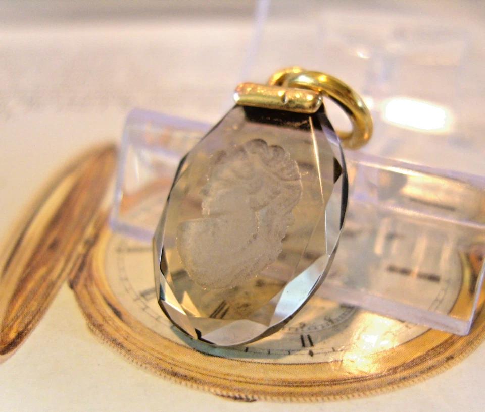 Wonderful heavily faceted smoky quartz glass 'stone' (reflects the light beautifully and is in amazing condition with no chips or 'flea nibbles') depicting to centre an etched intaglio image of a very attractive Victorian maiden.