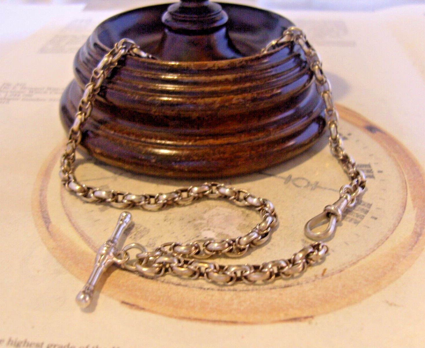 Pocket Watch Chain Victorian 1890s Antique Silver Nickel Albert With Fancy T Bar