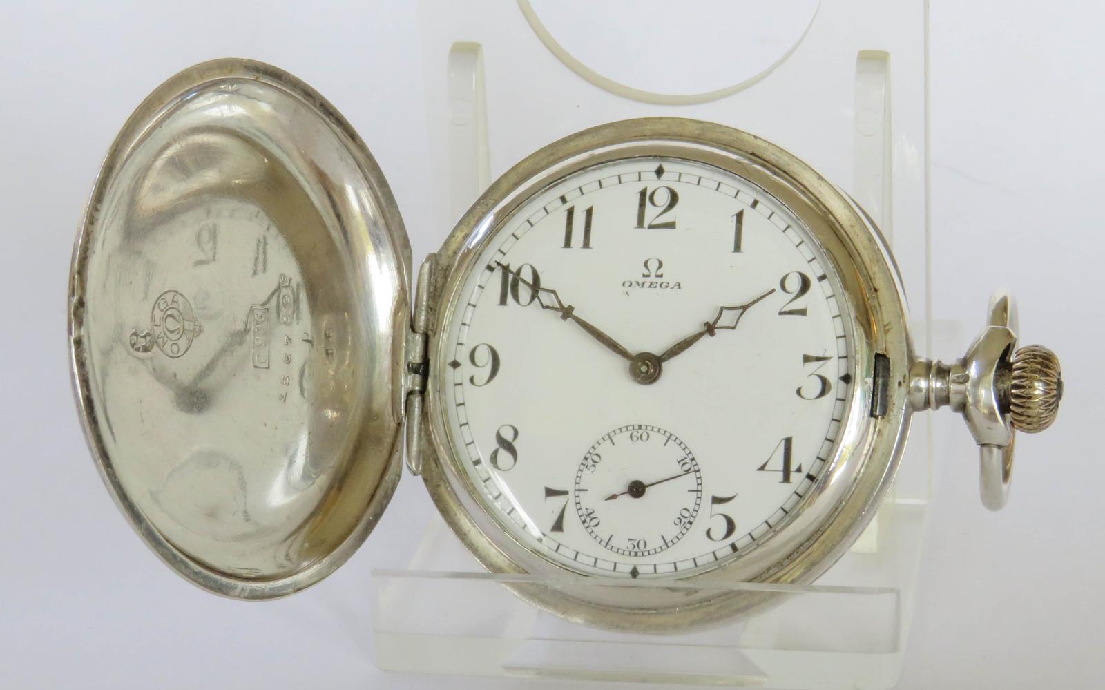 Pocket Watch: Silver Omega Full Hunter Fob Watch