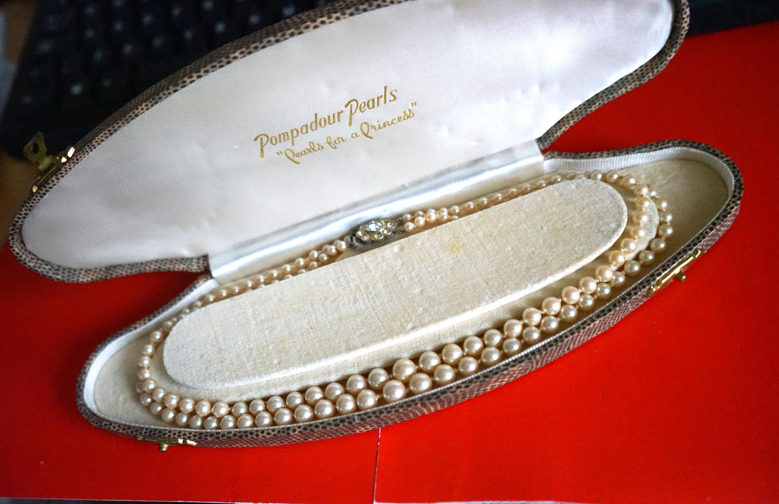 Antiques et Cetera has clarified that the Pompadour Boxed 16" Twin Pearl Necklace with Silver Clasp (LA558518) is genuinely of the period declared with the date/period of manufacture being 1950s