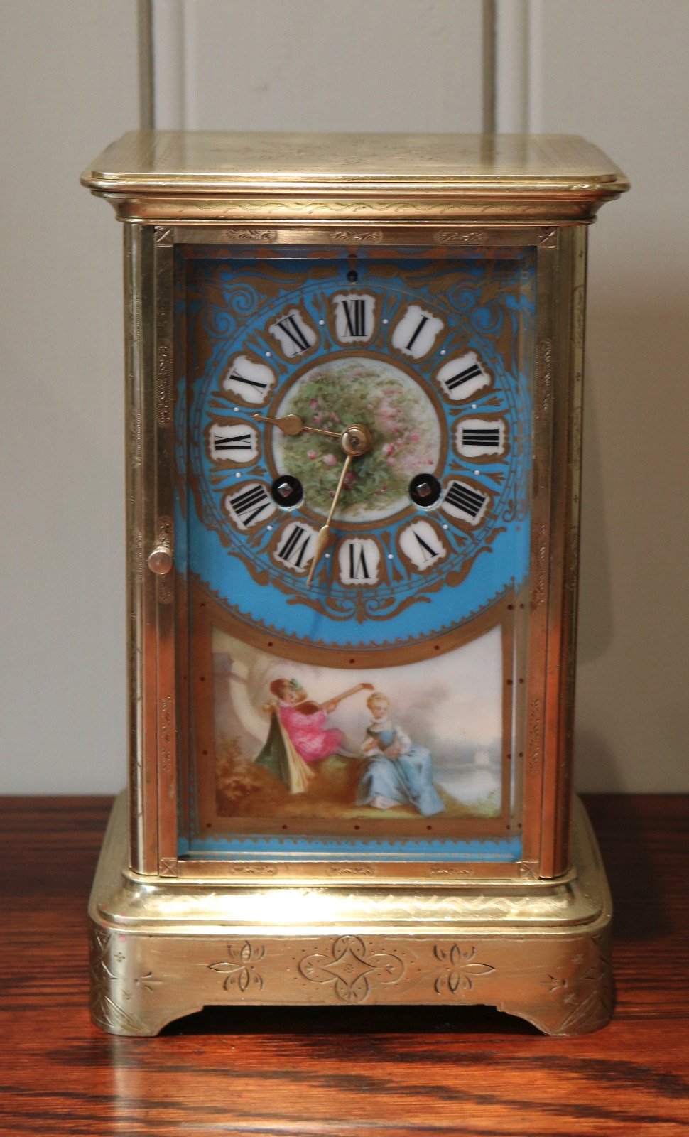 Porcelain Panel Bell Striking Four Glass Clock, French c. 1870 (1 of 1)