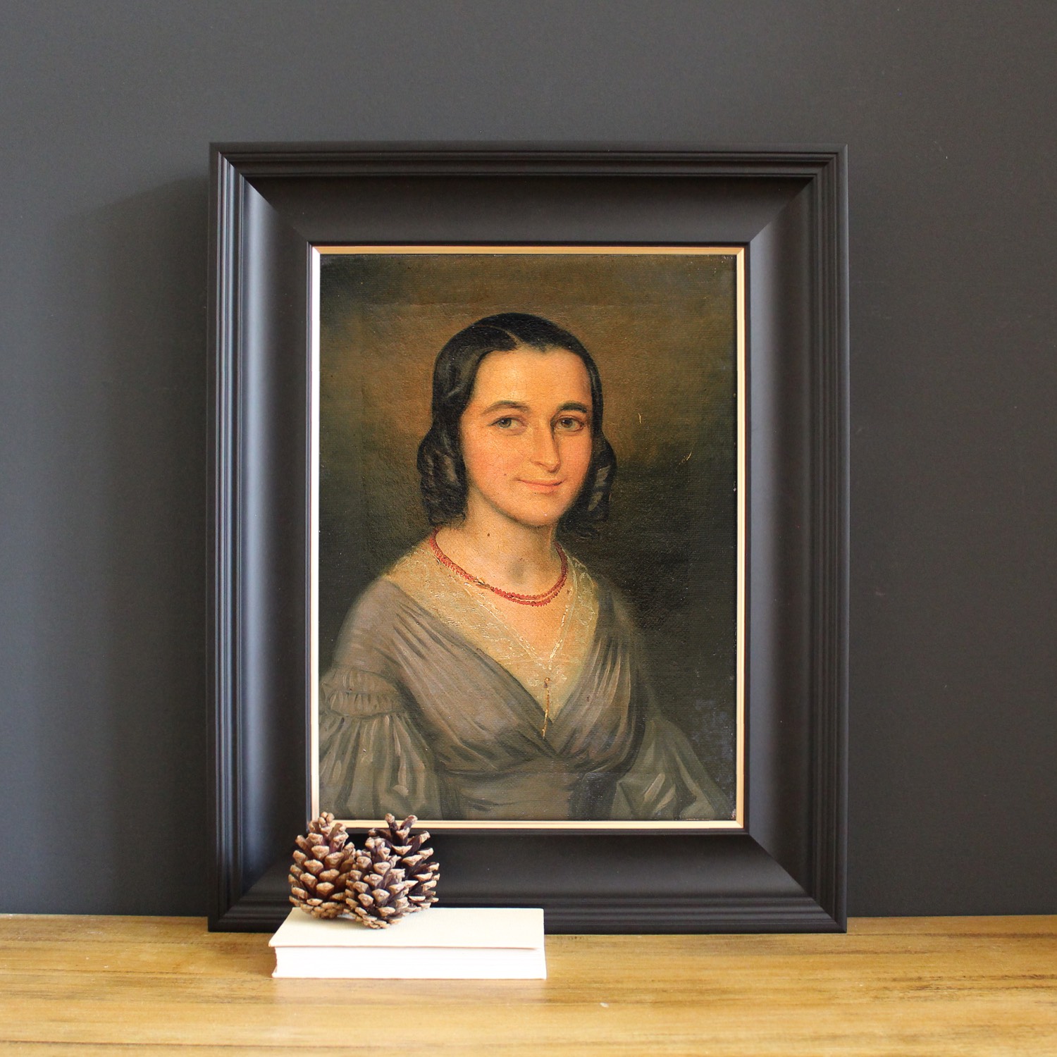 Portrait of a Lady with a Coral Necklace, Mid 19th Century Antique French Oil Painting