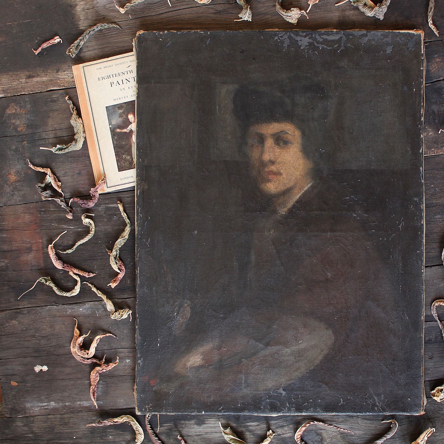 Portrait of Artist with Palette, Dark & Worn Antique Painting