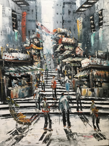 Pottinger Street, Hong Kong - Oil on Canvas - Brush & Palette Knife- Signed