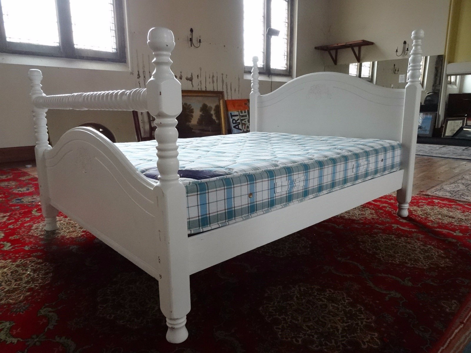 Pretty 20th Century Antique Style Painted Wooden Double Bed & Mattress - Farrow & Ball