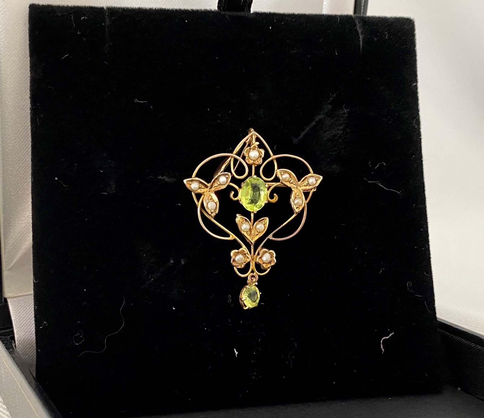 Pretty 9ct Peridot & Pearl Pendant / Brooch