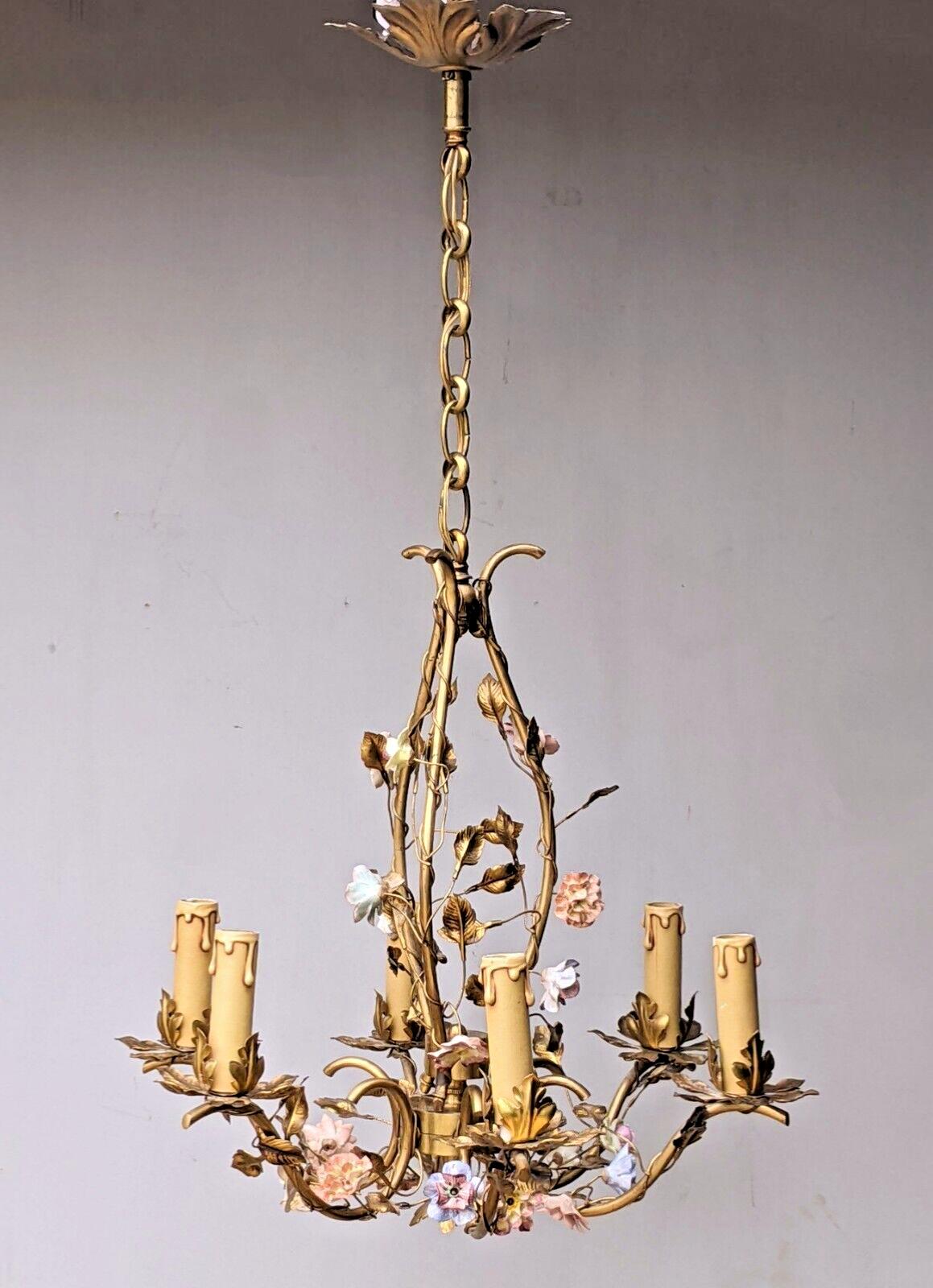 Pretty Antique Gilt Metal Ceramic Flower Chandelier