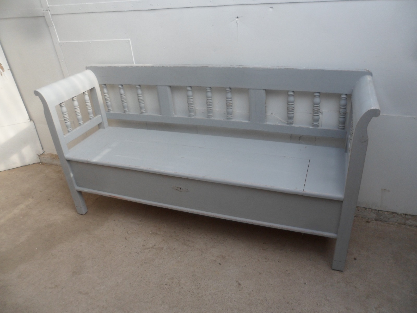 Pretty Columned Light Grey Old Pine 3 Seater Box Settle / Bench