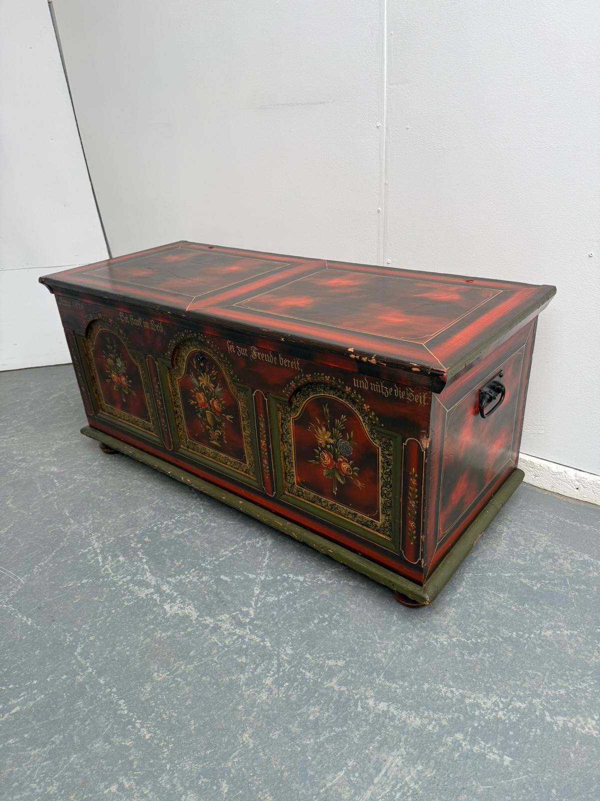 Pretty Floral Antique Pine Hungarian Painted Coffer Box / Coffee Table / TV Stand