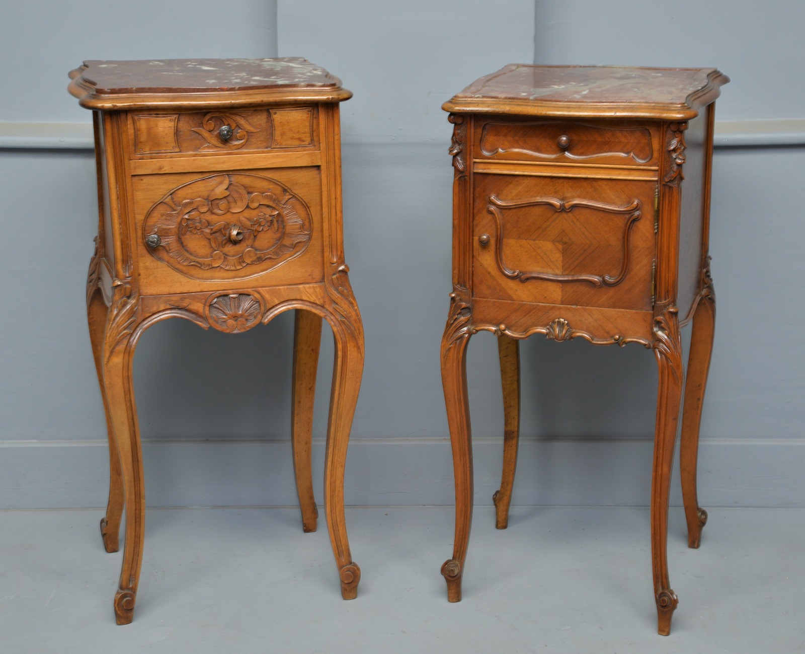 Pretty Matched Pair of French Walnut Bedside Marble-Top Cabinets c.1890