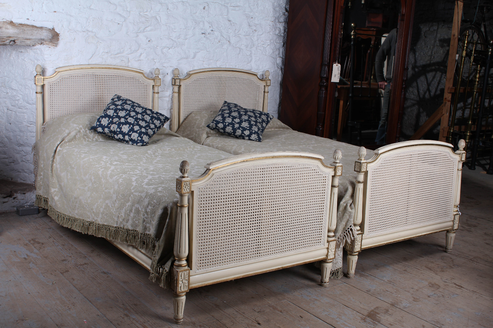Pretty Pair of French Painted Caned Single Beds c.1920 (1 of 9)