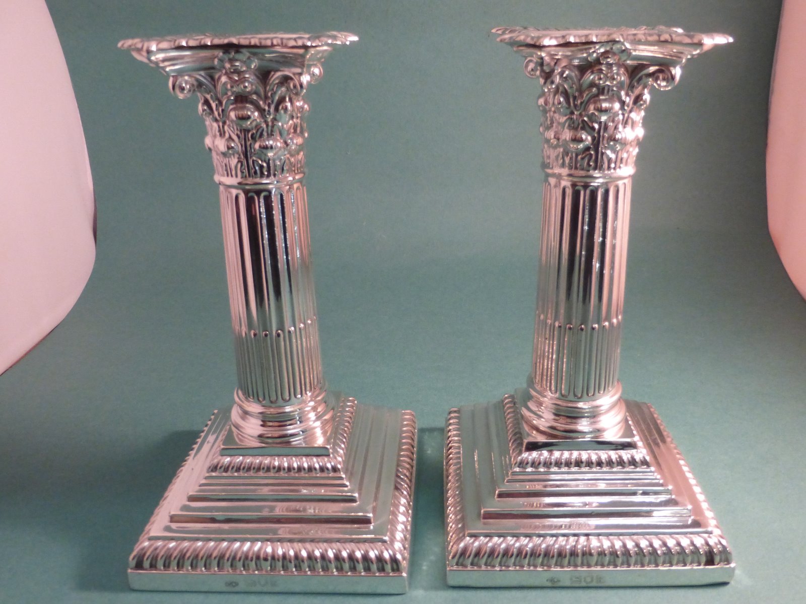 Pretty Pair of Short Column Antique Silver Candlesticks London 1905