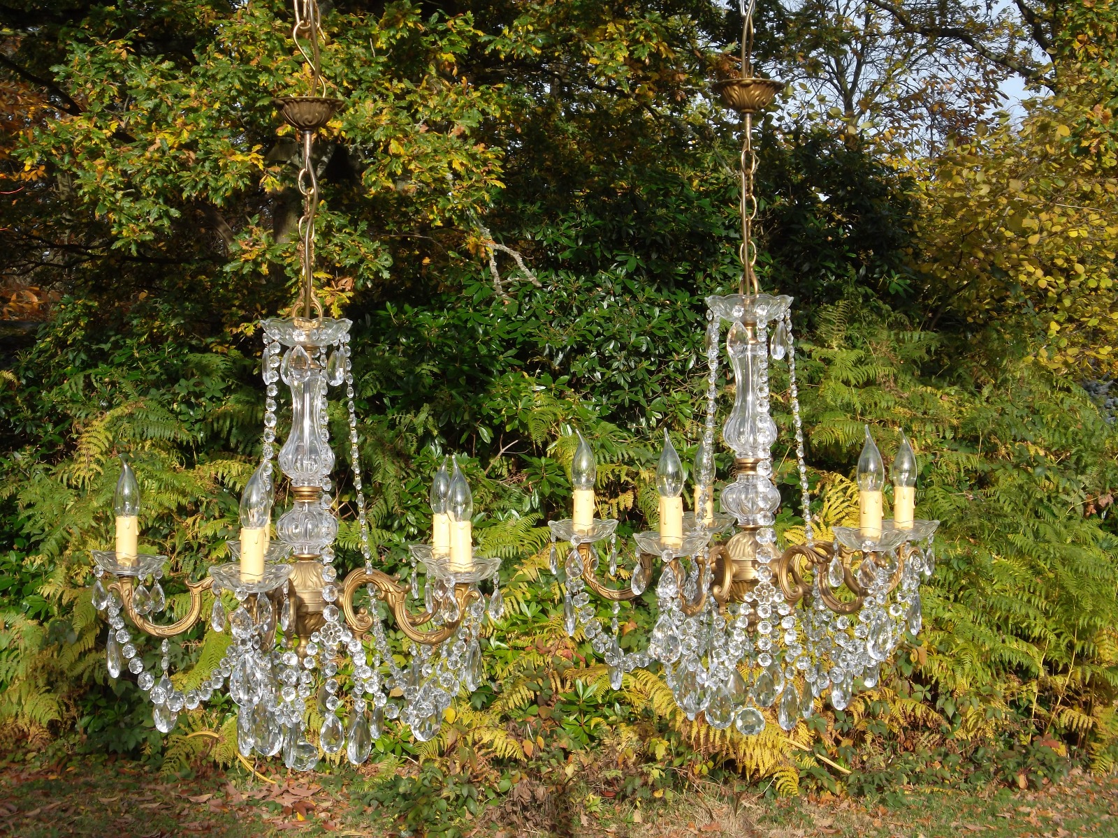 Pretty Unusual Pair of Vintage French 5 Arm Bronze / Glass Chandeliers