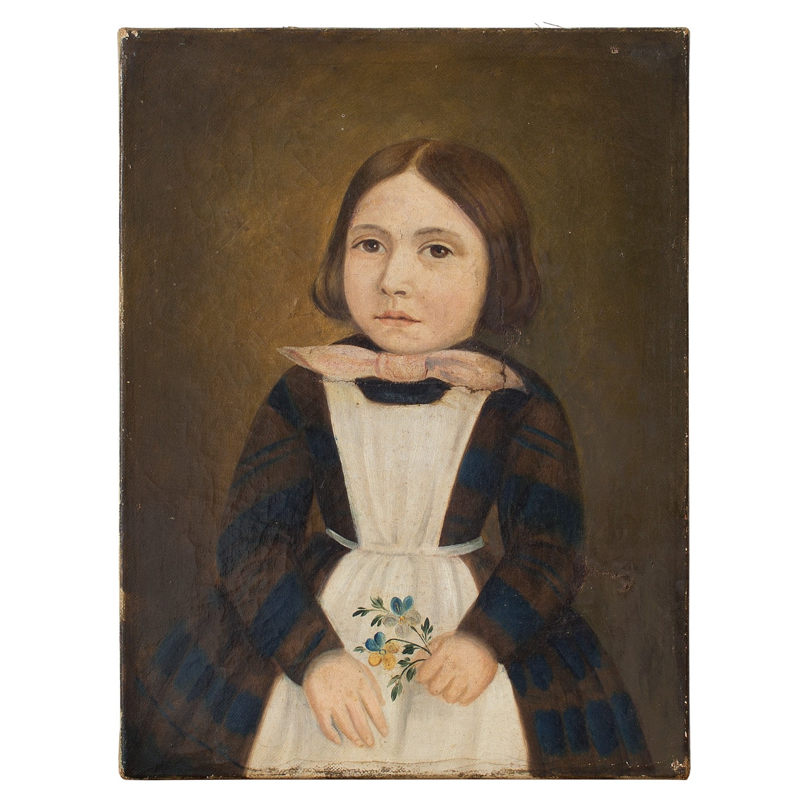 Provincial 19th Century Swiss School Portrait of Girl Holding Flowers, Folk Art