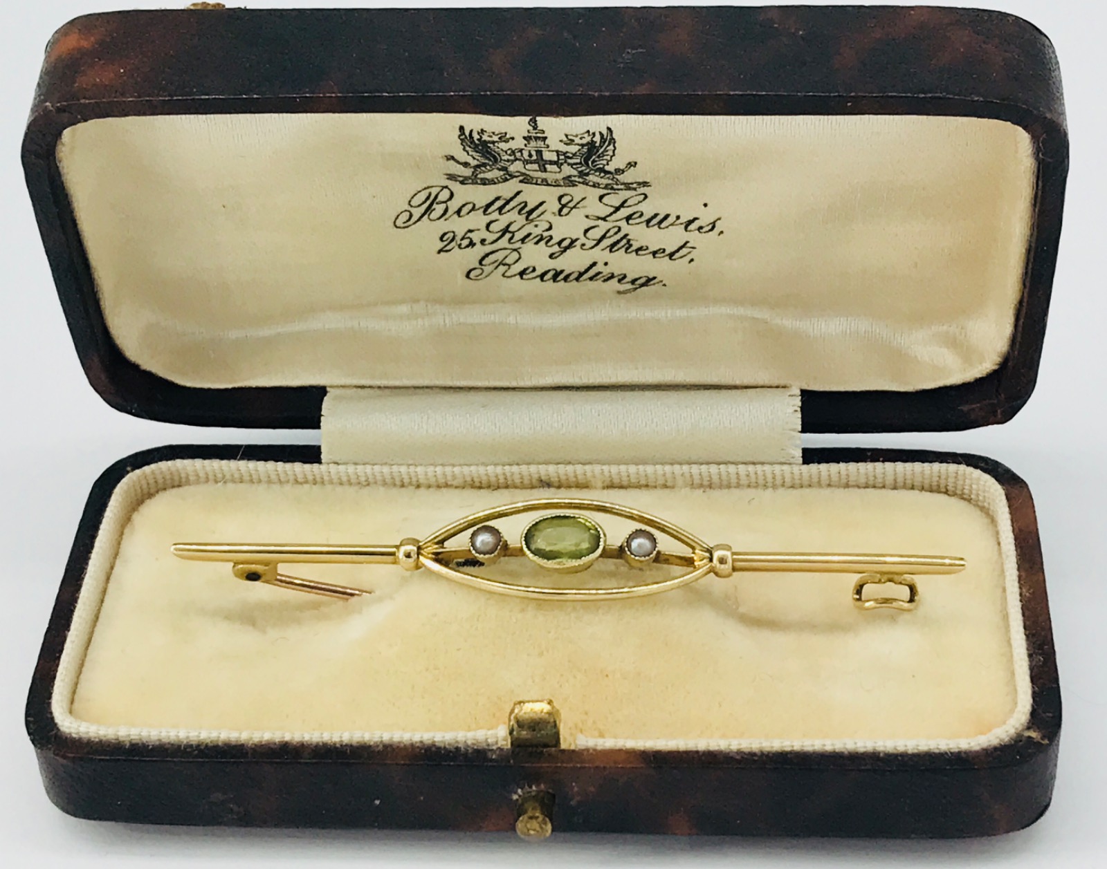 Quality 15ct Gold Peridot & Seed Pearl Bar Brooch c.1905
