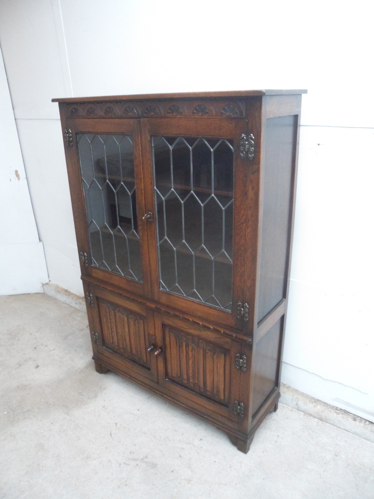 Quality 1920s Golden Oak Linenfold 4 Door Leaded Light Bookcase