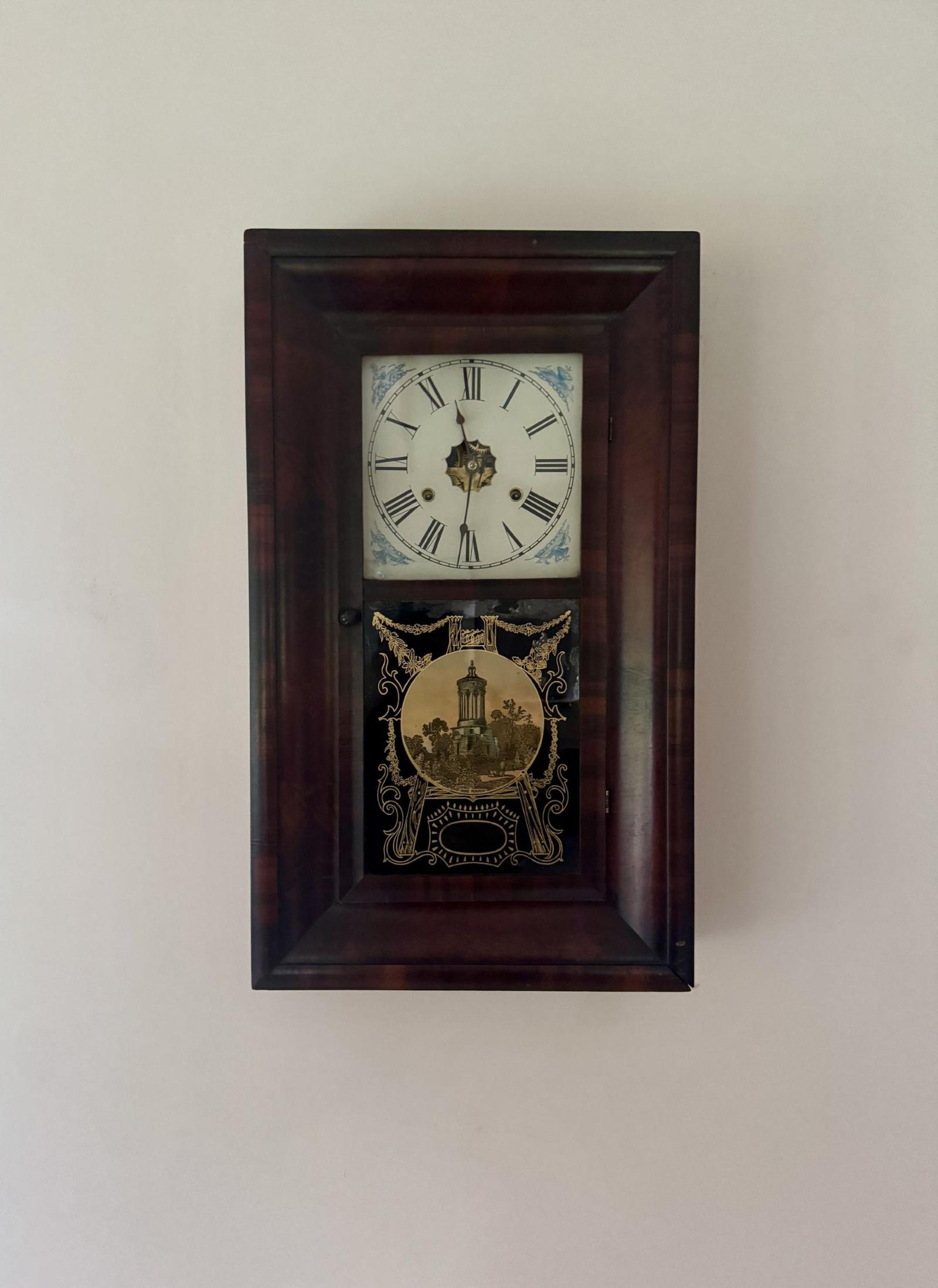 Quality 19th century mahogany American wall clock, having a quality antique wall clock with a rectangular shaped mahogany case with a single glazed door with a painted panel depicting the Burns monument, opening to reveal a 9 inch painted dial with Roman numerals and the original black spade hands, a drop down weighted pendulum, having an eight day movement striking on a gong. All clocks get serviced prior to delivery.