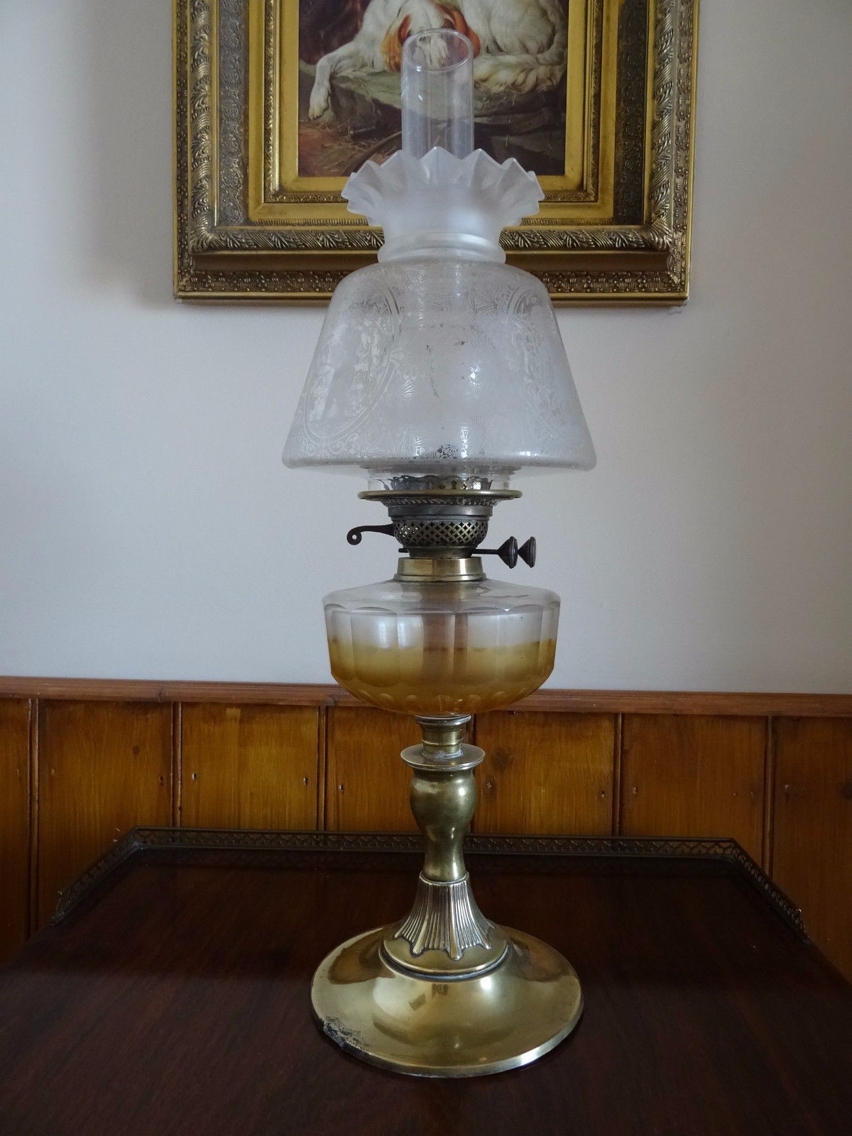 Quality 19th Century Twin Burning Brass Oil Lamp inc. Period Etched Shade