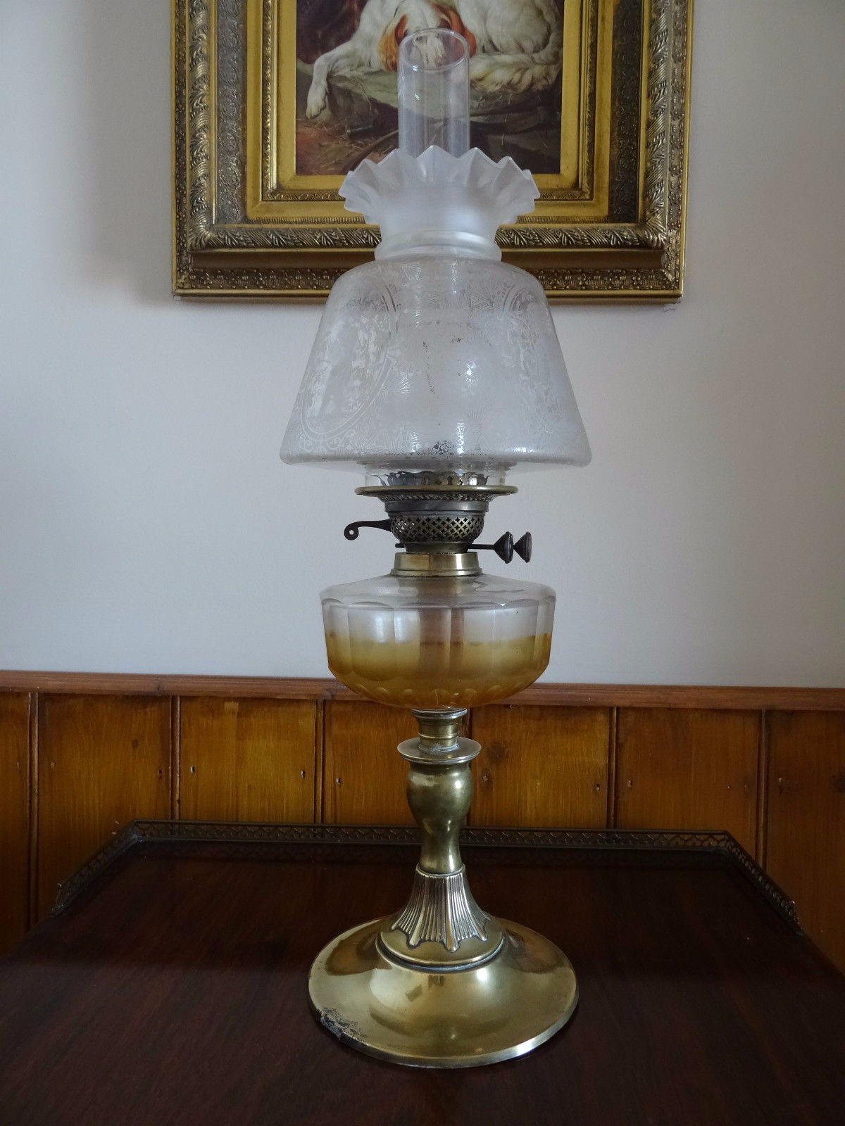 Quality 19th Century Twin Burning Brass Oil Lamp inc. Period Etched Shade c.1870