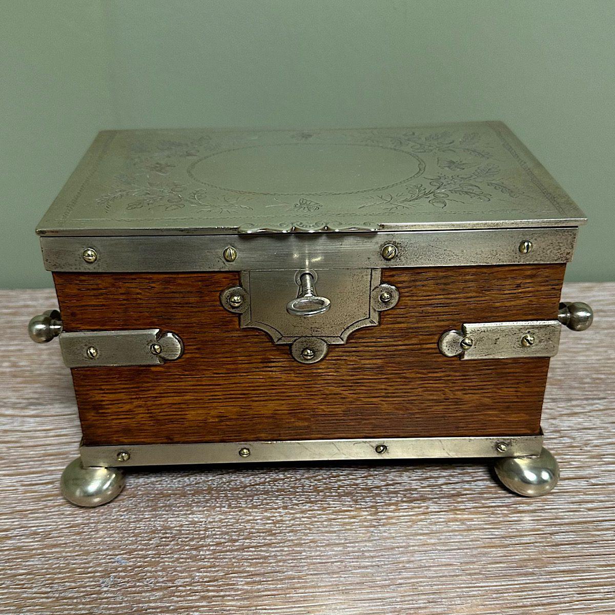 Quality Antique Oak Tea Caddy with Silver Plated Decoration