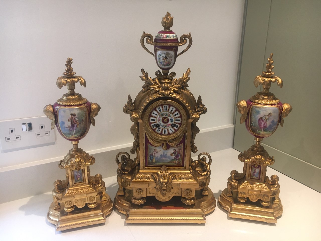 Quality Antique Ormolu & Porcelain Clock Set c.1870