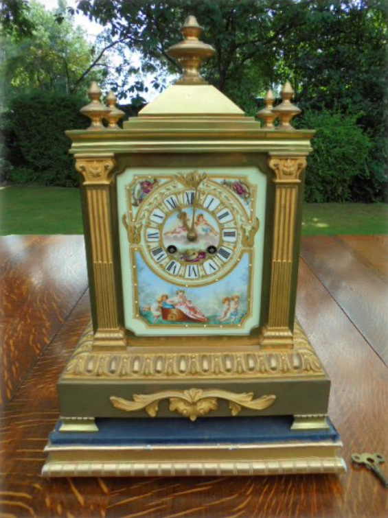 Quality Antique Porcelain & Brass Mantle Clock by Japy Freres c.1880