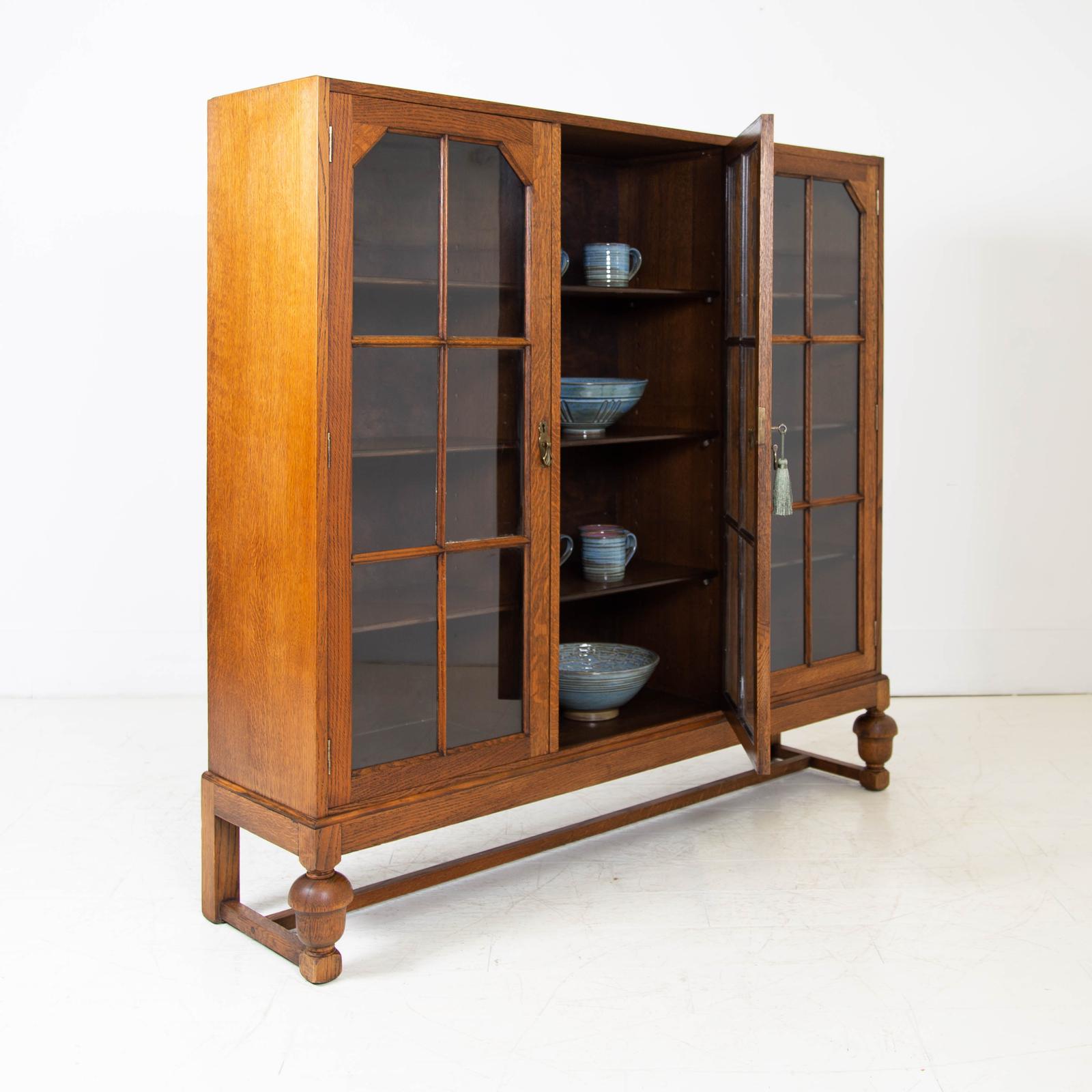 Quality Antique Triple Door Glazed English Oak Bookcase C1915