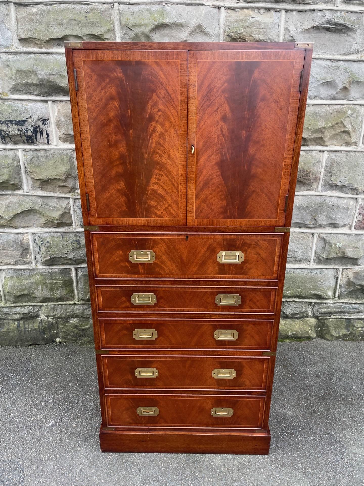 This Quality Brass Bound Mahogany Military Secretaire Chest is located in West Yorkshire, United Kingdom