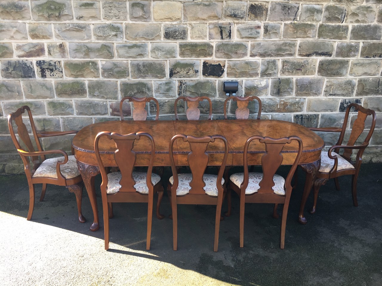 Quality Burr Walnut Extending Dining Table & 8 Chairs