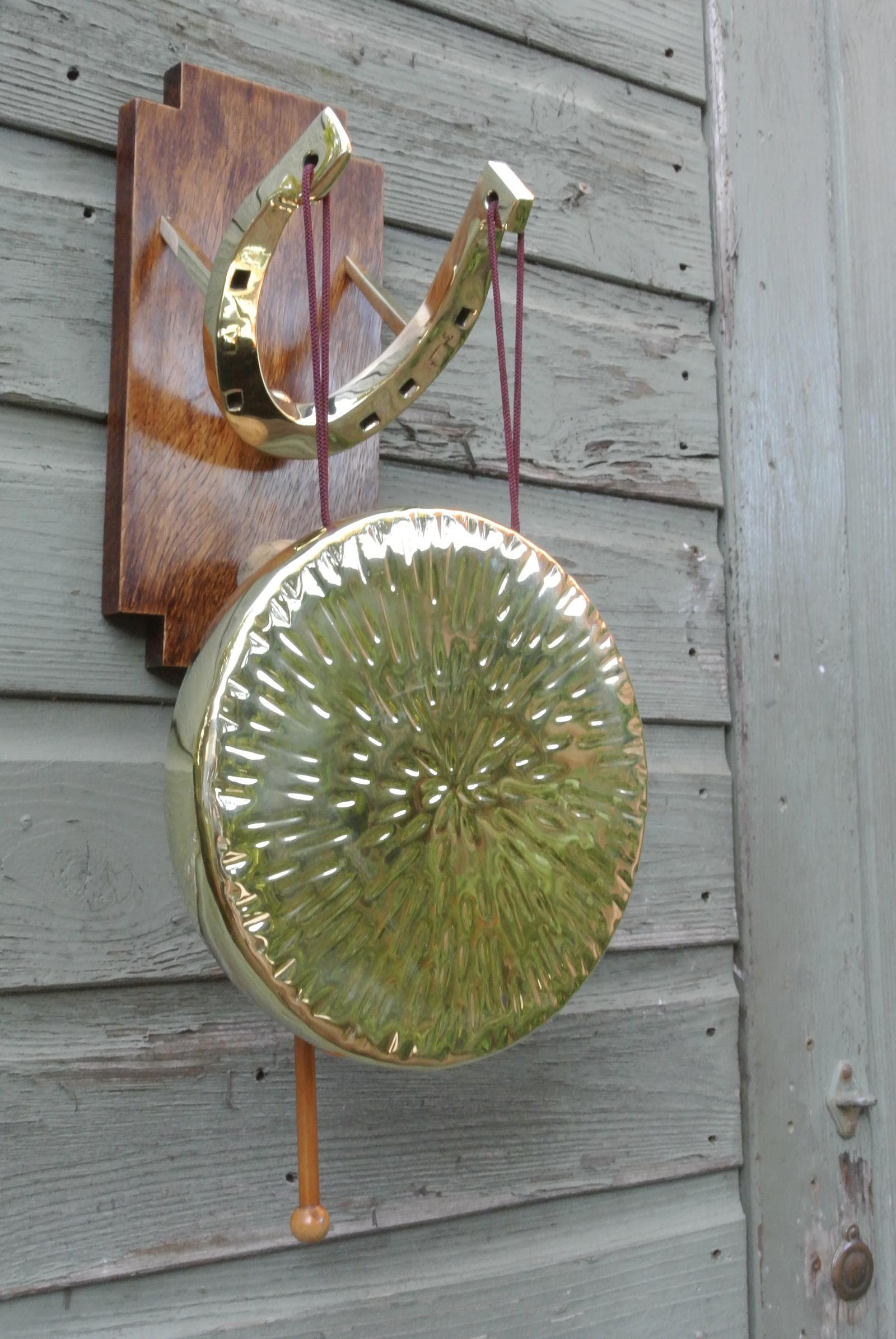 Quality Edwardian William Tonks Lucky Horseshoe Brass Dinner Gong with Oak Back Board c.1910