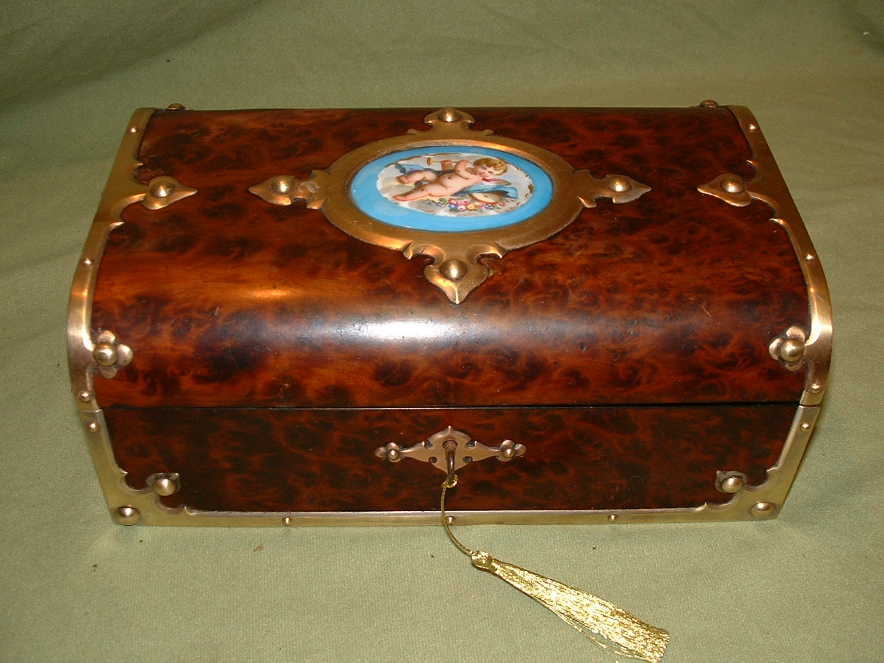 Quality French Amboyna Jewellery Box. Hand-Painted Porcelain Plaque c.1850