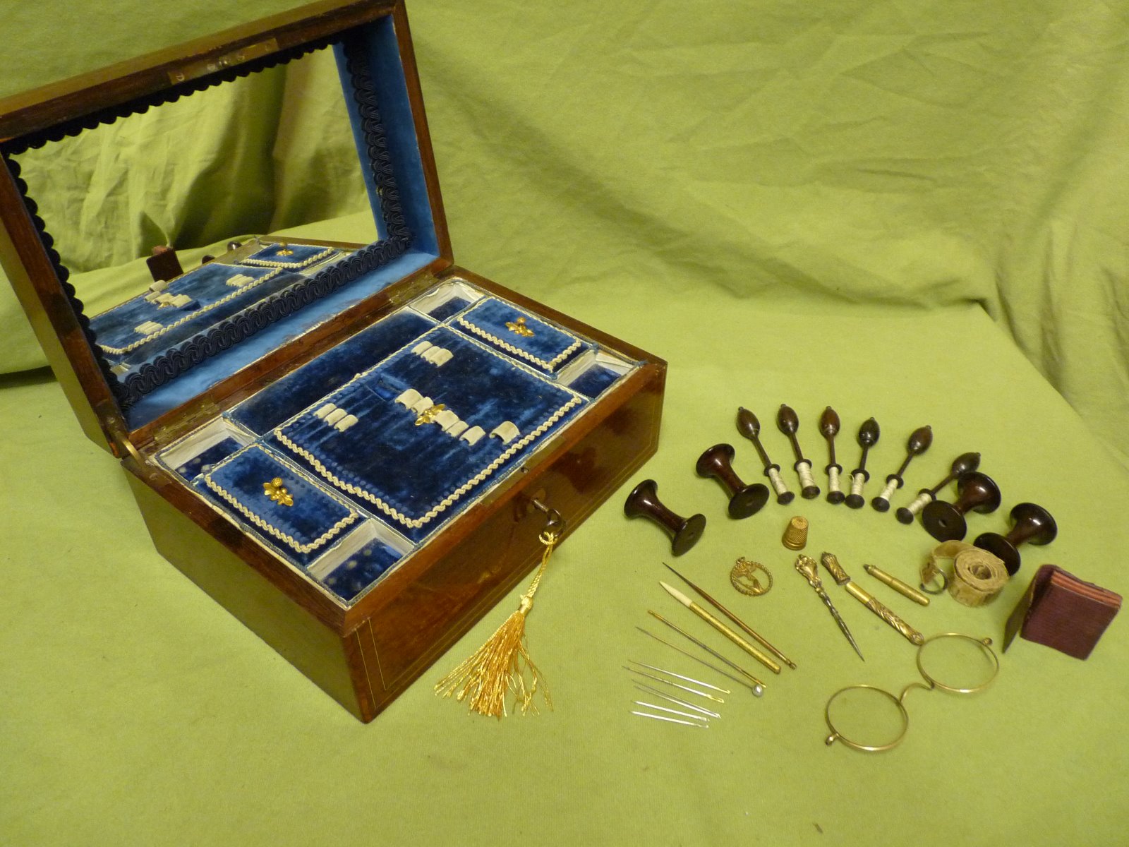 Quality French Inlaid Sewing Box + Quality Accessories c.1870